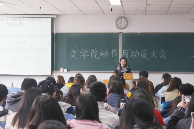 为了提高秘书学专业学生的素养,推进秘书学专业建设,3月21日中午,文学院于行知组团B303教室召开“秘书月”大赛动员大会。文学院院长杨学民、党总支书记佘一萍、教务处副处长陈会忠、文学院副院长张谦芬、秘书学教研室及秘书实务教研室全体教师、分团委书记刘丽老师出席了会议。