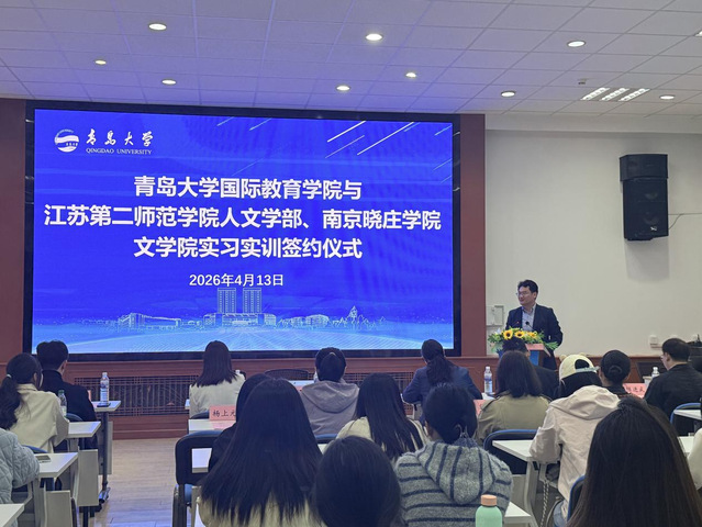 为进一步深化汉语国际教育专业建设,加强校际协同与资源共享,近日,文学院派20名2024级汉语国际教育专业学生赴青岛大学开展为期一周的见习活动。期间,师生参加了青岛大学国际教育学院、南京晓庄学院文学院、江苏第二师范学院人文部三方共同举办的合作交流、签约活动。4月17日,文学院院长张谦芬带领相关专业负责人、教研室主任及教师代表一行前往青岛大学国际教育学院,看望见习生并开展进一步合作交流研讨。青岛大学国际教育学院党委书记纪皓瑛、副院长崔云忠、副院长董卉川及相关专业负责人参加活动。