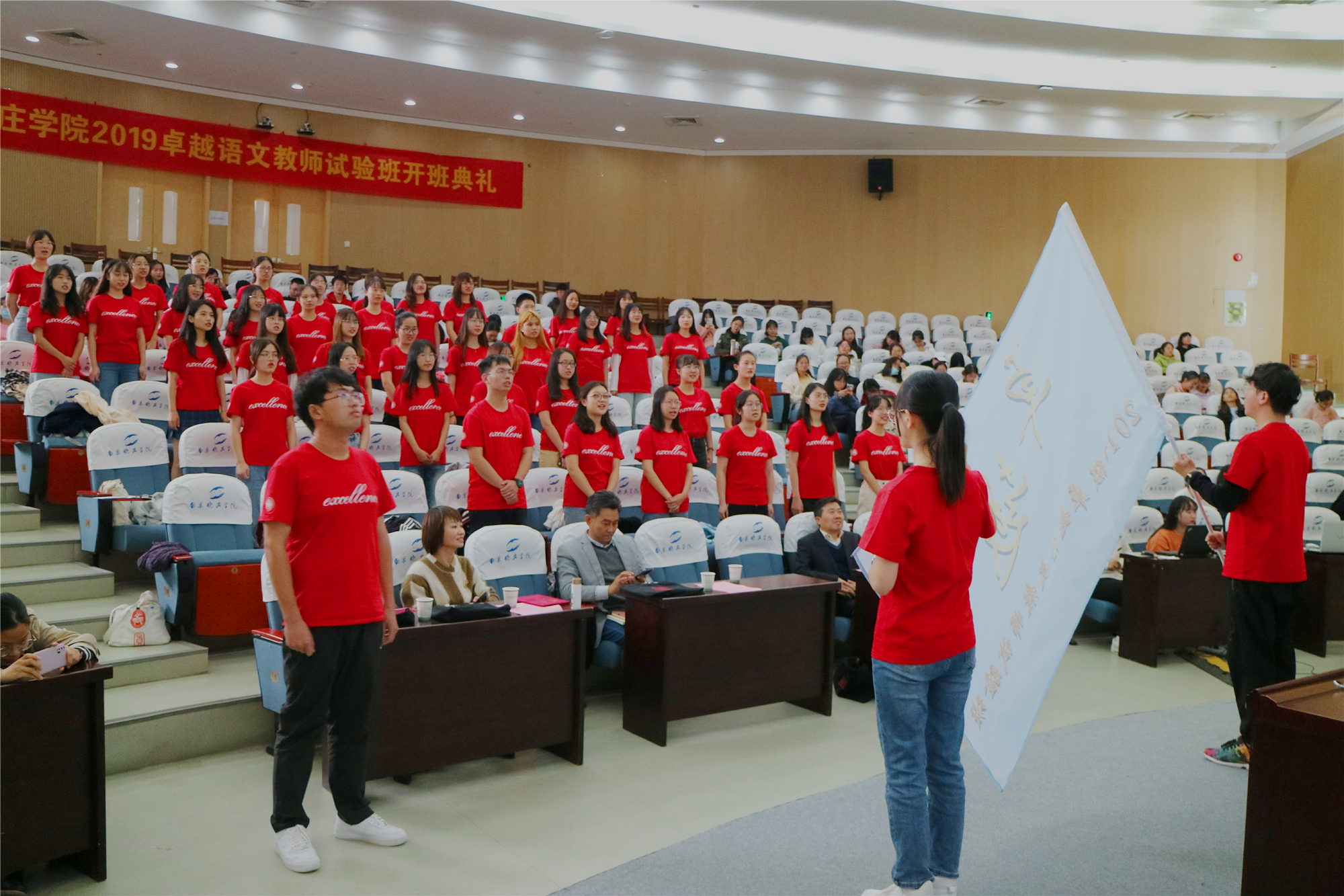 文学院院长杨学民教授首先致辞,他回顾了开办卓越班的初衷、举措和成效,表达了对新一期卓越班同学的期待。卓越班班主任李燕博士的一番心里话,对卓越班和非卓越班的同学都寄予殷殷期待,让在场的同学们备受感动。2017级邱钰涵同学作为文学院第一期卓越班班长到现场分享了在卓越班学习的心得体会,回顾了两年多时间里卓越班在学院关心和自身努力下的成长。典礼中,新一期卓越班学生代表马昕玥同学发言后,赵海天同学等从学工处李伟处长和文学院佘一萍书记手中接过班旗。最后,42名2019卓越班同学庄严宣誓,大家铿锵有力的声音回荡在报告厅,宣告着新的历程已经悄悄开始。