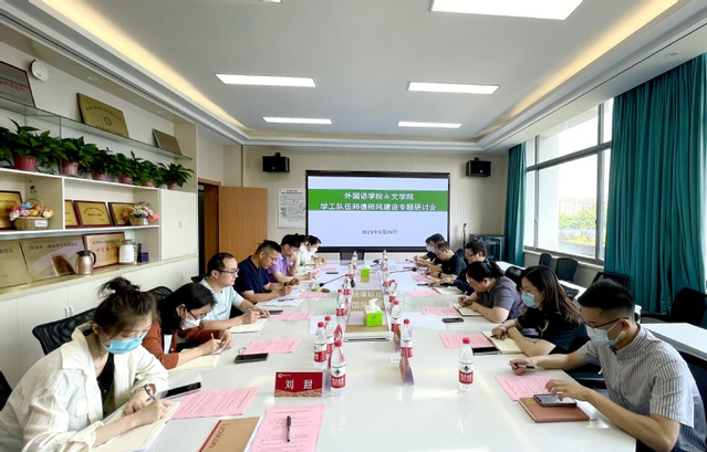 为深入贯彻新时代党的教育方针,落实学校开展主题教育和“师德师风建设月”活动相关要求,5月29日,文学院联合外国语学院召开学工队伍师德师风建设专题研讨会。文学院党总支书记刘克健,文学院副书记、副院长孙娟,外国语学院党总支副书记、副院长沈红伟以及全体辅导员参会。会议由外国语学院党总支书记马传浩主持。